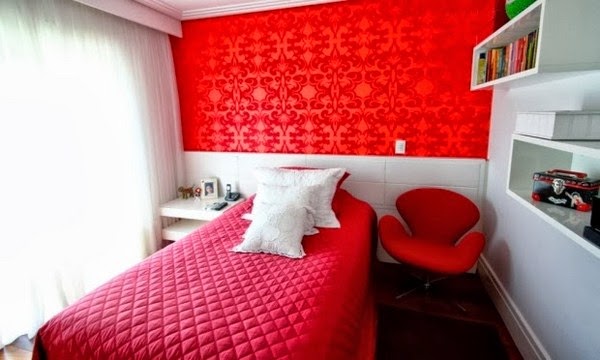 In both bedroom designs have a space reduced or small so accessories like mirrors and white walls is included to help create a more spacious and airy atmosphere. The bedroom is small but cozy and I love the detail in the wall, is a strip of writings and drawings that make this very original room. Moreover, this bedroom for girls in red, a strong color that transmits energy and which is also associated with the color that defines love. Part of the wall is covered with vinyl, decorative paper borders or red, it does contrast with red furniture that is the side of the bed. Also white drawers that go on the wall help to better organize things the room and take advantage of the available space.